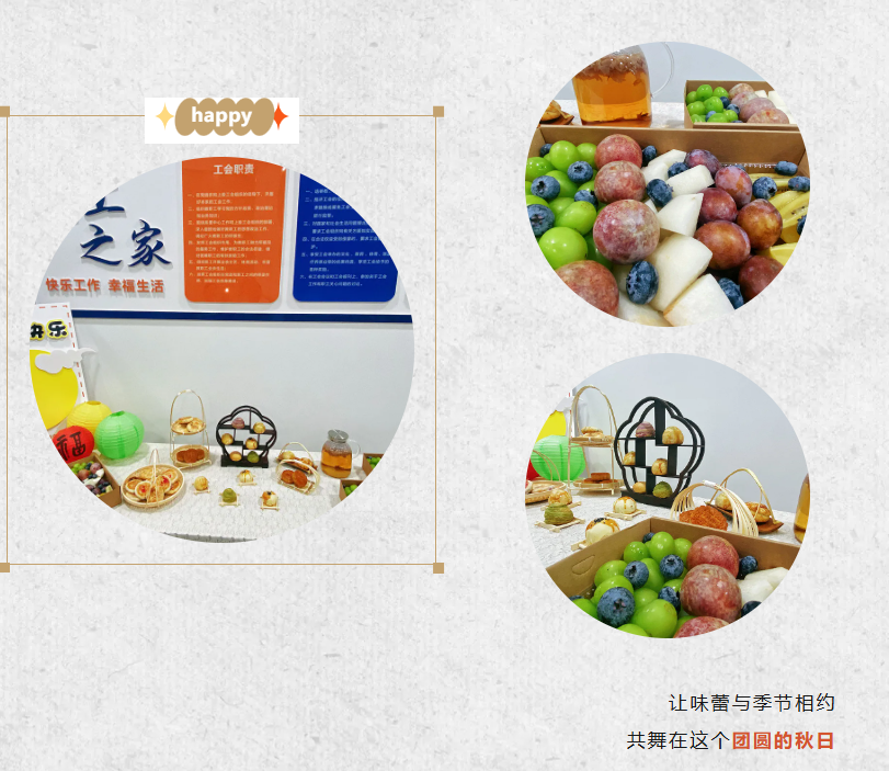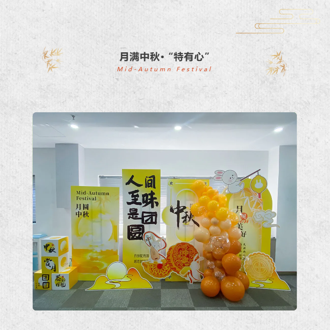 今天的公司內(nèi)洋溢著濃濃的節(jié)日氛圍。我們?cè)缭缇途牟贾昧嘶顒?dòng)場(chǎng)地,月餅、水果、特色小禮品等節(jié)日福利琳